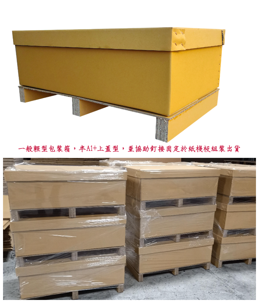 首頁 產品實例 重型包裝紙箱 <中圍-上下蓋型>重包裝紙箱 產品實例 PRODUCTS 分類目錄 重型包裝紙箱 重包裝紙木箱 圓管類重紙箱 高強度八角箱 客製化紙棧板 各式客製隔板 各式包裝材料 <中圍-上下蓋型>重包裝紙箱 中圍-上下蓋型 拆、裝簡易且快速,大幅降低人力與時間成本。 通常搭配紙棧板或木棧板,則可使用拖板車或堆高機移動。 免開版即可印刷。 回上一頁